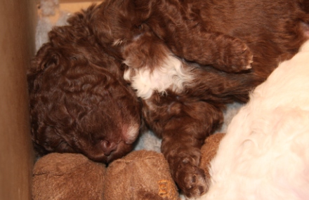 Nur der Erstgeborene Rüde ist dem Schokoüberzug entkommen. Jetzt sind wir gespannt ob er eine Braun- oder Schwarznase wird.